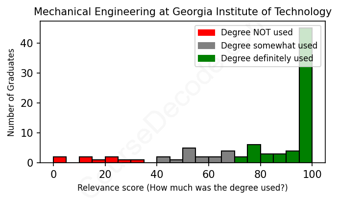 The verdict? Significantly above average. Overall, with an average relevance score of 79%, Mechanical Engineering graduates from Georgia Institute of Technology have a much higher likelihood (+12%) of finding work in this field compared to the average graduate across all fields:
