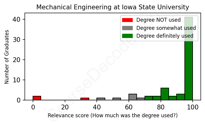 The verdict? Significantly above average. Overall, with an average relevance score of 87%, Mechanical Engineering graduates from Iowa State University have a much higher likelihood (+20%) of finding work in this field compared to the average graduate across all fields: