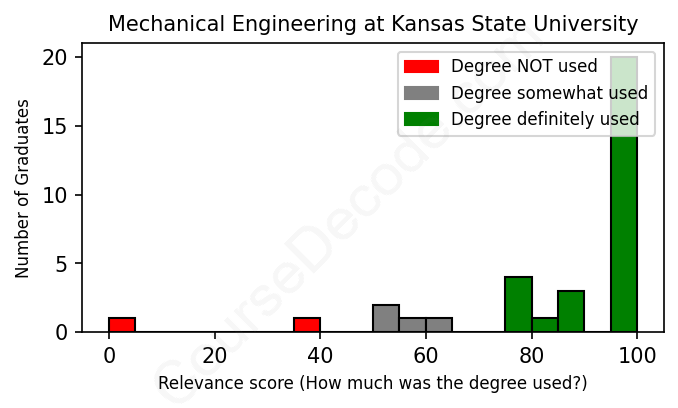 The verdict? Significantly above average. Overall, with an average relevance score of 85%, Mechanical Engineering graduates from Kansas State University have a much higher likelihood (+18%) of finding work in this field compared to the average graduate across all fields: