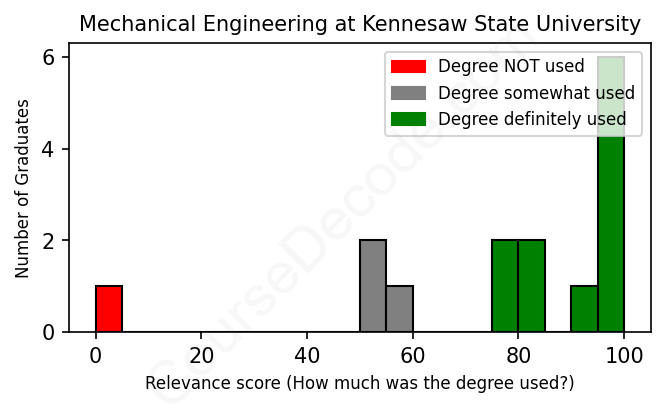 The verdict? Significantly above average. Overall, with an average relevance score of 78%, Mechanical Engineering graduates from Kennesaw State University have a much higher likelihood (+11%) of finding work in this field compared to the average graduate across all fields: