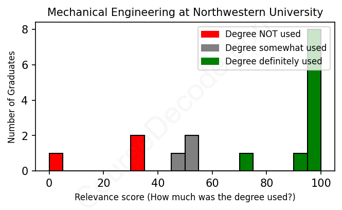 The verdict? Above average. Overall, with an average relevance score of 73%, Mechanical Engineering graduates from Northwestern University have a higher likelihood (+6%) of finding work in this field compared to the average graduate across all fields: