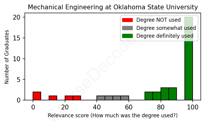 The verdict? Significantly above average. Overall, with an average relevance score of 78%, Mechanical Engineering graduates from Oklahoma State University have a much higher likelihood (+11%) of finding work in this field compared to the average graduate across all fields: