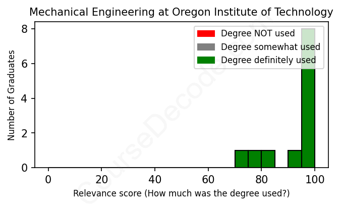 The verdict? Great! Overall, with an average relevance score of 93%, Mechanical Engineering graduates from Oregon Institute of Technology have a substantially higher likelihood (+26%) of finding work in this field compared to the average graduate across all fields: