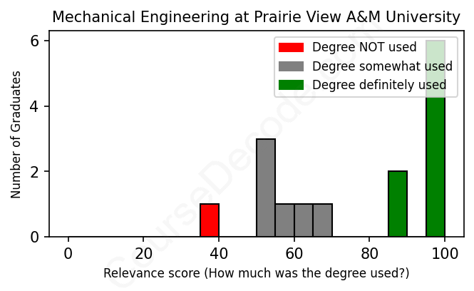 The verdict? Above average. Overall, with an average relevance score of 76%, Mechanical Engineering graduates from Prairie View A&M University have a higher likelihood (+9%) of finding work in this field compared to the average graduate across all fields: