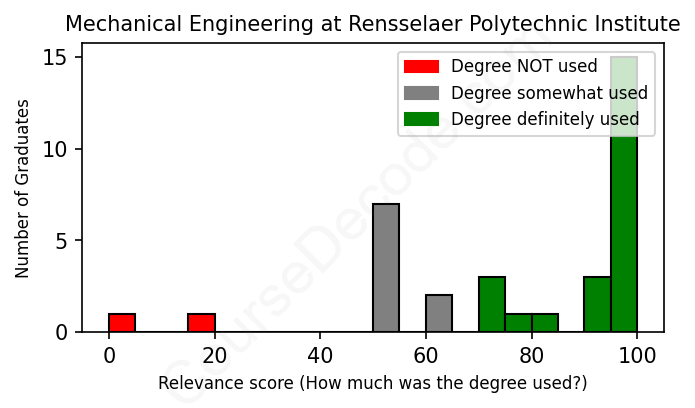 The verdict? Above average. Overall, with an average relevance score of 77%, Mechanical Engineering graduates from Rensselaer Polytechnic Institute have a higher likelihood (+10%) of finding work in this field compared to the average graduate across all fields: