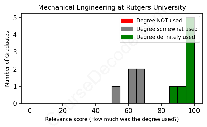 The verdict? Significantly above average. Overall, with an average relevance score of 81%, Mechanical Engineering graduates from Rutgers University have a much higher likelihood (+14%) of finding work in this field compared to the average graduate across all fields: