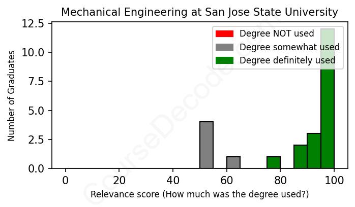 The verdict? Significantly above average. Overall, with an average relevance score of 86%, Mechanical Engineering graduates from San Jose State University have a much higher likelihood (+19%) of finding work in this field compared to the average graduate across all fields: