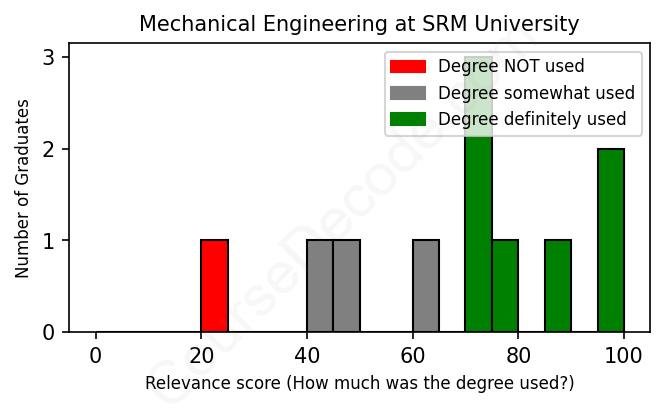 The verdict? Slightly above average. Overall, with an average relevance score of 68%, Mechanical Engineering graduates from SRM University have a slightly higher likelihood (+1%) of finding work in this field compared to the average graduate across all fields: