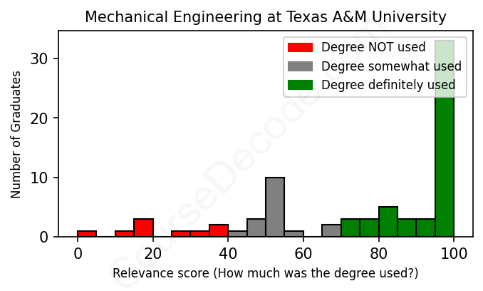 The verdict? Above average. Overall, with an average relevance score of 75%, Mechanical Engineering graduates from Texas A&M University have a higher likelihood (+8%) of finding work in this field compared to the average graduate across all fields: