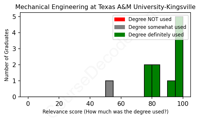 The verdict? Significantly above average. Overall, with an average relevance score of 87%, Mechanical Engineering graduates from Texas A&M University-Kingsville have a much higher likelihood (+20%) of finding work in this field compared to the average graduate across all fields: