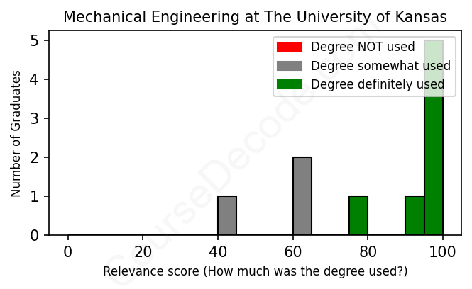 The verdict? Significantly above average. Overall, with an average relevance score of 83%, Mechanical Engineering graduates from The University of Kansas have a much higher likelihood (+16%) of finding work in this field compared to the average graduate across all fields: