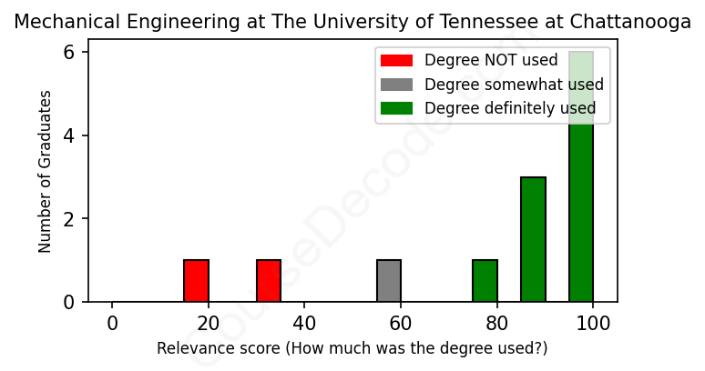 The verdict? Significantly above average. Overall, with an average relevance score of 80%, Mechanical Engineering graduates from The University of Tennessee at Chattanooga have a much higher likelihood (+13%) of finding work in this field compared to the average graduate across all fields: