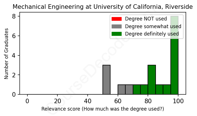 The verdict? Significantly above average. Overall, with an average relevance score of 82%, Mechanical Engineering graduates from University of California, Riverside have a much higher likelihood (+15%) of finding work in this field compared to the average graduate across all fields: