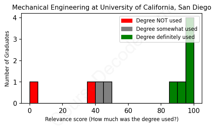 The verdict? Slightly above average. Overall, with an average relevance score of 70%, Mechanical Engineering graduates from University of California, San Diego have a slightly higher likelihood (+3%) of finding work in this field compared to the average graduate across all fields: