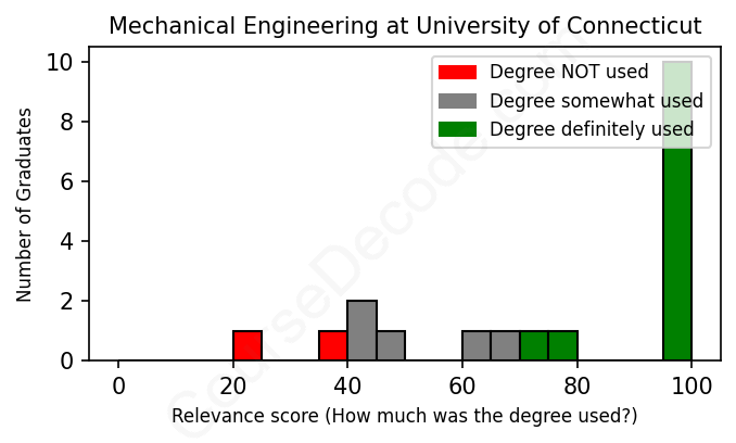 The verdict? Above average. Overall, with an average relevance score of 77%, Mechanical Engineering graduates from University of Connecticut have a higher likelihood (+10%) of finding work in this field compared to the average graduate across all fields: