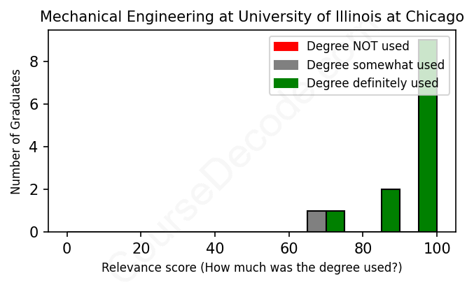 The verdict? Great! Overall, with an average relevance score of 93%, Mechanical Engineering graduates from University of Illinois at Chicago have a substantially higher likelihood (+26%) of finding work in this field compared to the average graduate across all fields: