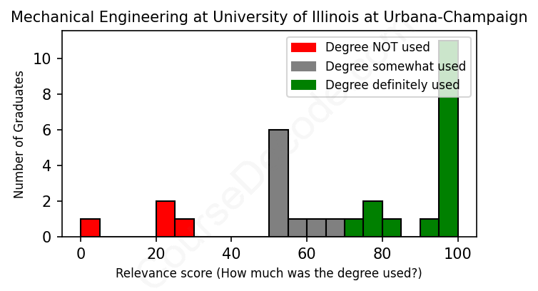 The verdict? Slightly above average. Overall, with an average relevance score of 70%, Mechanical Engineering graduates from University of Illinois at Urbana-Champaign have a slightly higher likelihood (+3%) of finding work in this field compared to the average graduate across all fields:
