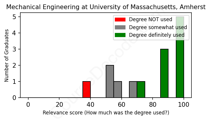 The verdict? Significantly above average. Overall, with an average relevance score of 84%, Mechanical Engineering graduates from University of Massachusetts Amherst have a much higher likelihood (+17%) of finding work in this field compared to the average graduate across all fields: