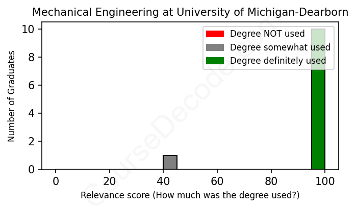 The verdict? Great! Overall, with an average relevance score of 94%, Mechanical Engineering graduates from University of Michigan-Dearborn have a substantially higher likelihood (+27%) of finding work in this field compared to the average graduate across all fields: