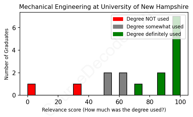 The verdict? Above average. Overall, with an average relevance score of 75%, Mechanical Engineering graduates from University of New Hampshire have a higher likelihood (+8%) of finding work in this field compared to the average graduate across all fields: