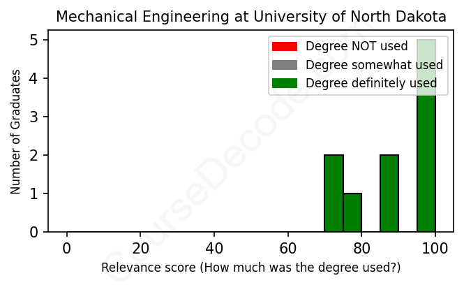 The verdict? Great! Overall, with an average relevance score of 90%, Mechanical Engineering graduates from University of North Dakota have a substantially higher likelihood (+23%) of finding work in this field compared to the average graduate across all fields: