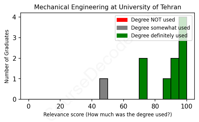 The verdict? Significantly above average. Overall, with an average relevance score of 86%, Mechanical Engineering graduates from University of Tehran have a much higher likelihood (+19%) of finding work in this field compared to the average graduate across all fields: