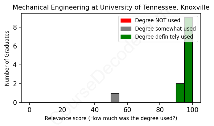 The verdict? Great! Overall, with an average relevance score of 94%, Mechanical Engineering graduates from University of Tennessee, Knoxville have a substantially higher likelihood (+27%) of finding work in this field compared to the average graduate across all fields: