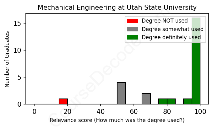 The verdict? Significantly above average. Overall, with an average relevance score of 84%, Mechanical Engineering graduates from Utah State University have a much higher likelihood (+17%) of finding work in this field compared to the average graduate across all fields: