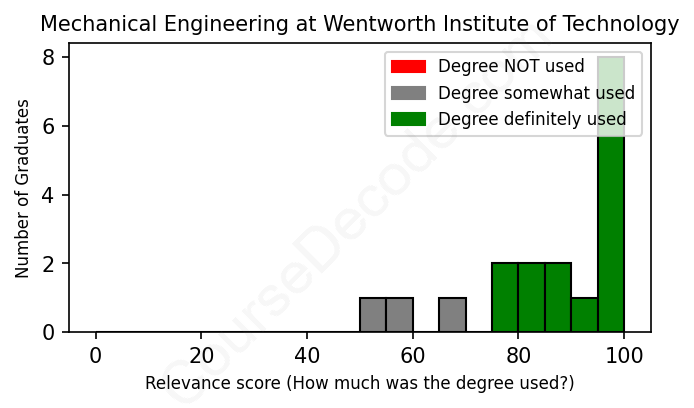 The verdict? Significantly above average. Overall, with an average relevance score of 86%, Mechanical Engineering graduates from Wentworth Institute of Technology have a much higher likelihood (+19%) of finding work in this field compared to the average graduate across all fields: