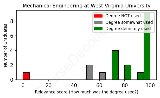 The verdict? Significantly above average. Overall, with an average relevance score of 80%, Mechanical Engineering graduates from West Virginia University have a much higher likelihood (+13%) of finding work in this field compared to the average graduate across all fields: