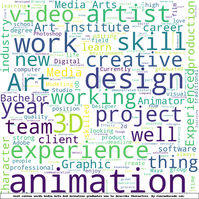 Here is a visual representation of the most common words seen in the "about" section of LinkedIn profiles who have a Bachelor degree in Media Arts And Animation. This may or may not be useful: