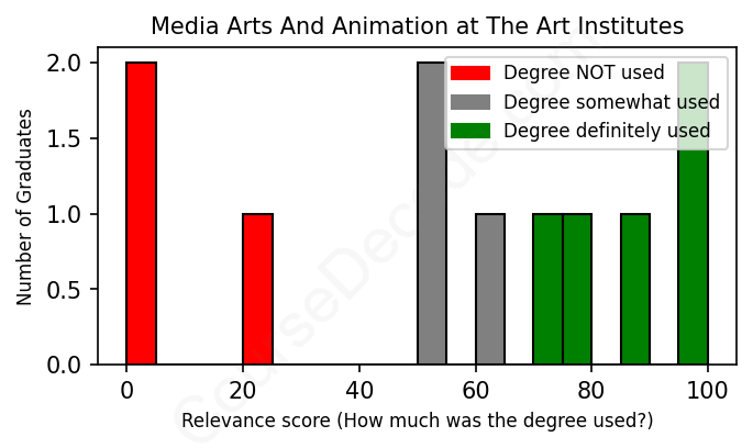 The verdict? Significantly below average. Overall, with an average relevance score of 56%, Media Arts And Animation graduates from The Art Institutes have a much lower likelihood (-11%) of finding work in this field compared to the average graduate across all fields: