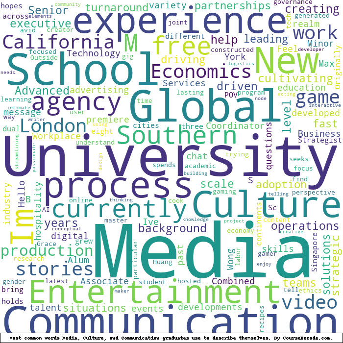 Here is a visual representation of the most common words seen in the "about" section of LinkedIn profiles who have a Bachelor degree in Media, Culture, and Communication (this is across all Media, Culture, and Communication graduates we've analyzed, not just those who went to New York University). This may or may not be useful: