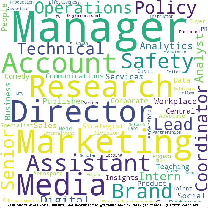 Here is a visual representation of the most common words in job titles for Media, Culture, and Communication graduates (this is across all Media, Culture, and Communication graduates we've analyzed, not just those who went to New York University):