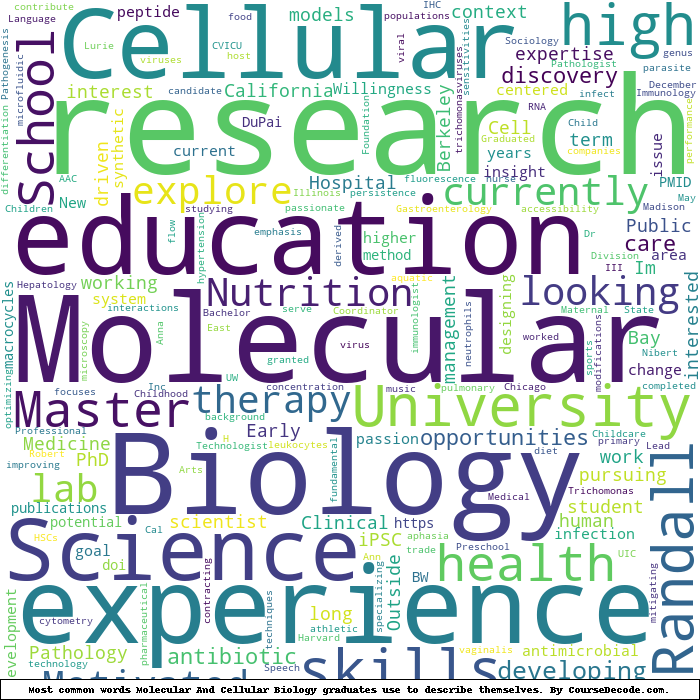 Here is a visual representation of the most common words seen in the "about" section of LinkedIn profiles who have a Bachelor degree in Molecular And Cellular Biology (this is across all Molecular And Cellular Biology graduates we've analyzed, not just those who went to University of Illinois at Urbana-Champaign). This may or may not be useful:
