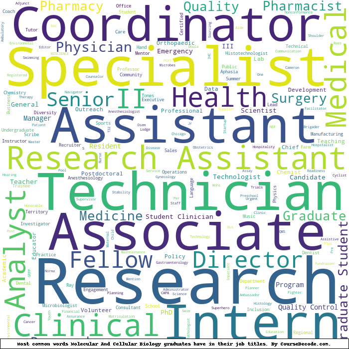 Here is a visual representation of the most common words in job titles for Molecular And Cellular Biology graduates (this is across all Molecular And Cellular Biology graduates we've analyzed, not just those who went to University of Illinois at Urbana-Champaign):