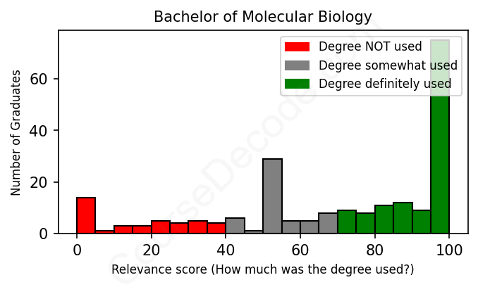 The verdict? Slightly above average. Overall, with an average relevance score of 69%, Molecular Biology graduates have a slightly higher likelihood (+2%) of finding work in this field compared to the average graduate across all fields: