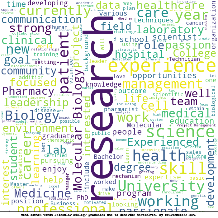 Here is a visual representation of the most common words seen in the "about" section of LinkedIn profiles who have a Bachelor degree in Molecular Biology. This may or may not be useful: