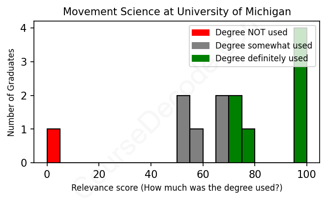 The verdict? Slightly above average. Overall, with an average relevance score of 70%, Movement Science graduates from University of Michigan have a slightly higher likelihood (+3%) of finding work in this field compared to the average graduate across all fields: