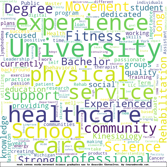Here is a visual representation of the most common words seen in the "about" section of LinkedIn profiles who have a Bachelor degree in Movement Science (this is across all Movement Science graduates we've analyzed, not just those who went to University of Michigan). This may or may not be useful: