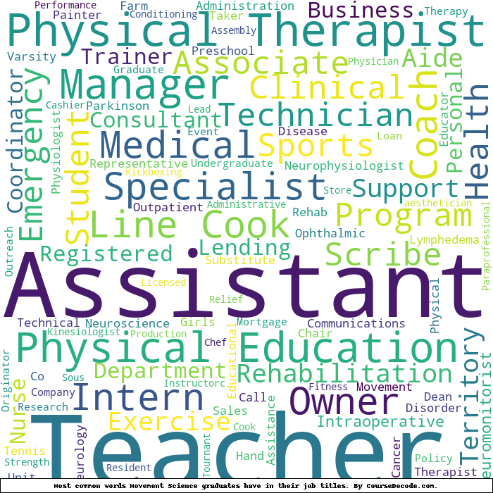 Here is a visual representation of the most common words in job titles for Movement Science graduates (this is across all Movement Science graduates we've analyzed, not just those who went to University of Michigan):