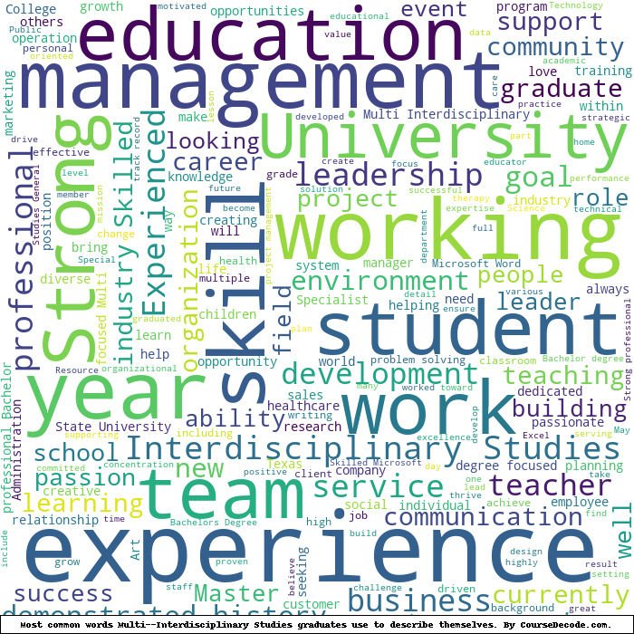 Here is a visual representation of the most common words seen in the "about" section of LinkedIn profiles who have a Bachelor degree in Multi--Interdisciplinary Studies. This may or may not be useful: