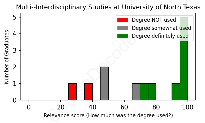 First, some facts. Of the Multi--Interdisciplinary Studies graduates from University of North Texas we've analyzed , here's how many have used (or NOT used) their degree in their career: