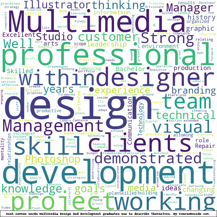 Here is a visual representation of the most common words seen in the "about" section of LinkedIn profiles who have a Bachelor degree in Multimedia Design And Development (this is across all Multimedia Design And Development graduates we've analyzed, not just those who went to DeVry University). This may or may not be useful: