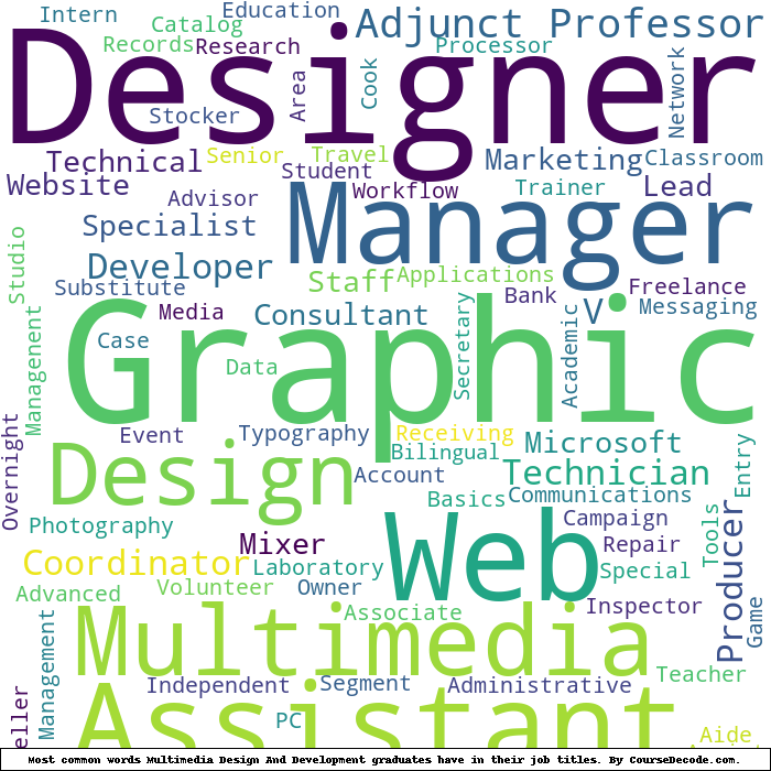 Here is a visual representation of the most common words in job titles for Multimedia Design And Development graduates (this is across all Multimedia Design And Development graduates we've analyzed, not just those who went to DeVry University):