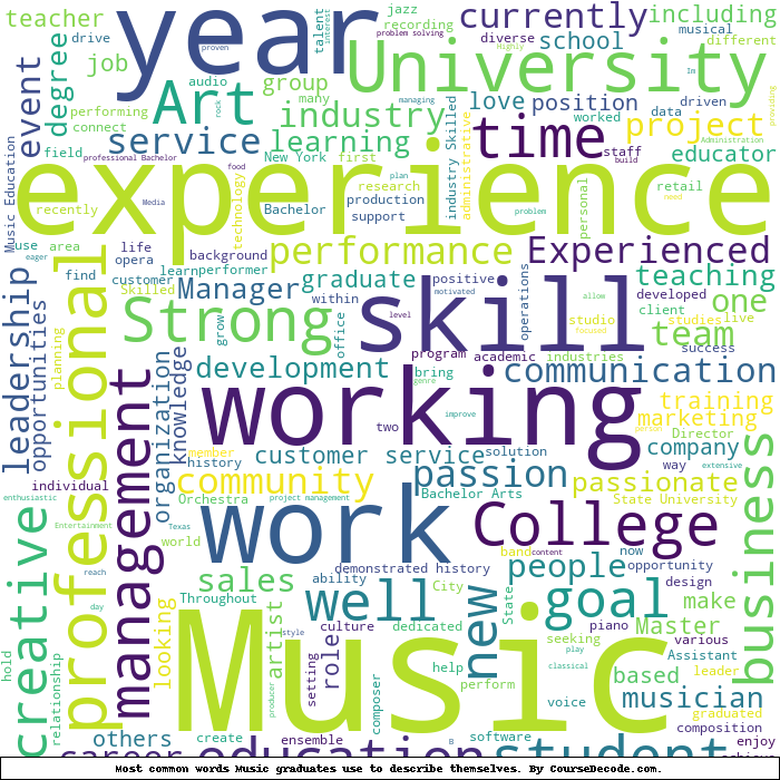 Here is a visual representation of the most common words seen in the "about" section of LinkedIn profiles who have a Bachelor degree in Music. This may or may not be useful:
