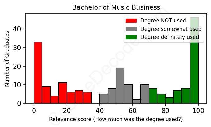 The verdict? Significantly below average. Overall, with an average relevance score of 52%, Music Business graduates have a much lower likelihood (-15%) of finding work in this field compared to the average graduate across all fields: