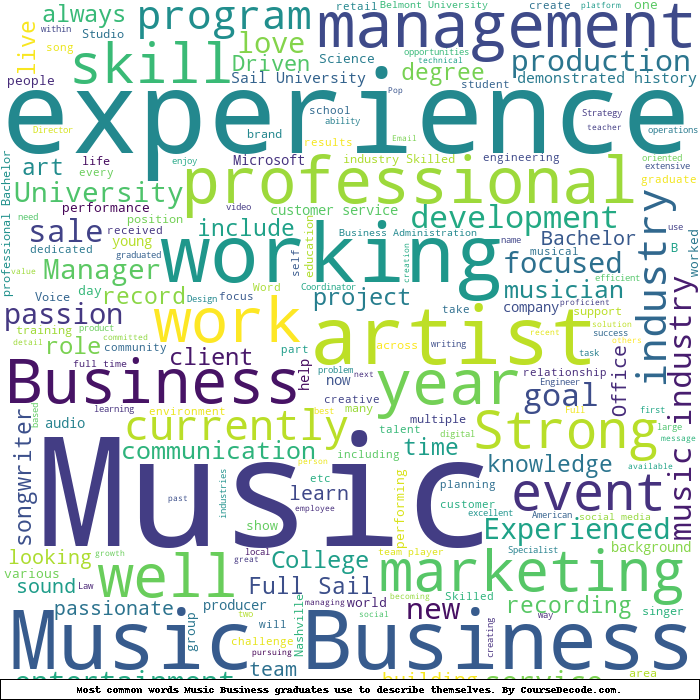 Here is a visual representation of the most common words seen in the "about" section of LinkedIn profiles who have a Bachelor degree in Music Business. This may or may not be useful: