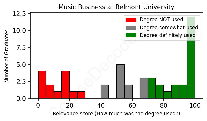 The verdict? Below average. Overall, with an average relevance score of 59%, Music Business graduates from Belmont University have a lower likelihood (-8%) of finding work in this field compared to the average graduate across all fields: