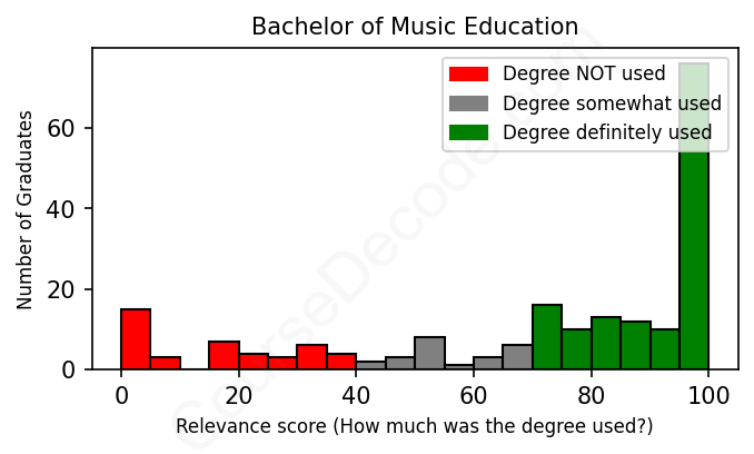 The verdict? Slightly above average. Overall, with an average relevance score of 71%, Music Education graduates have a slightly higher likelihood (+4%) of finding work in this field compared to the average graduate across all fields: